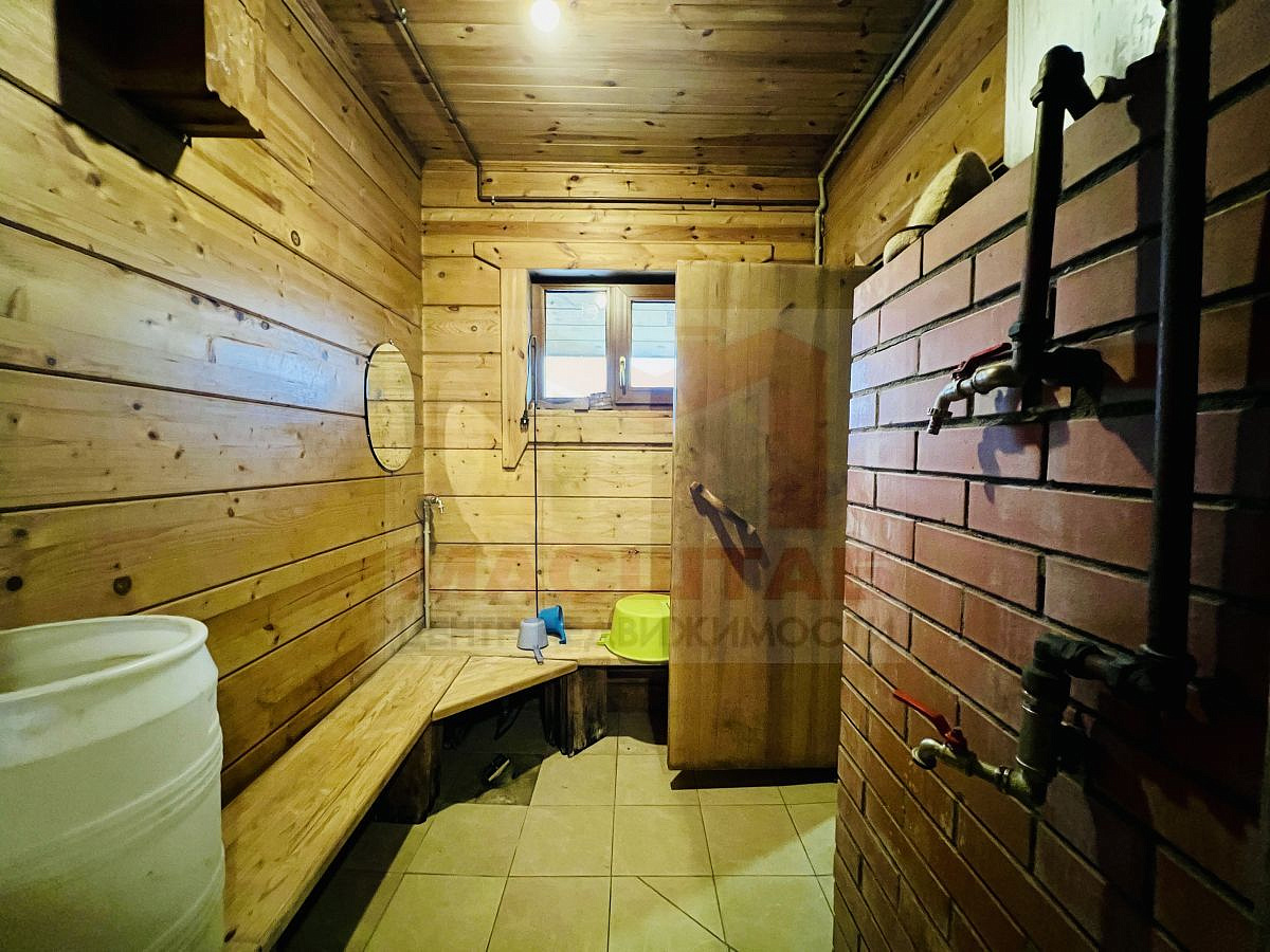 Дом возведен из клеенного бруса, имеет два этажа. На первом этаже располагается баня, второй этаж большая комната.