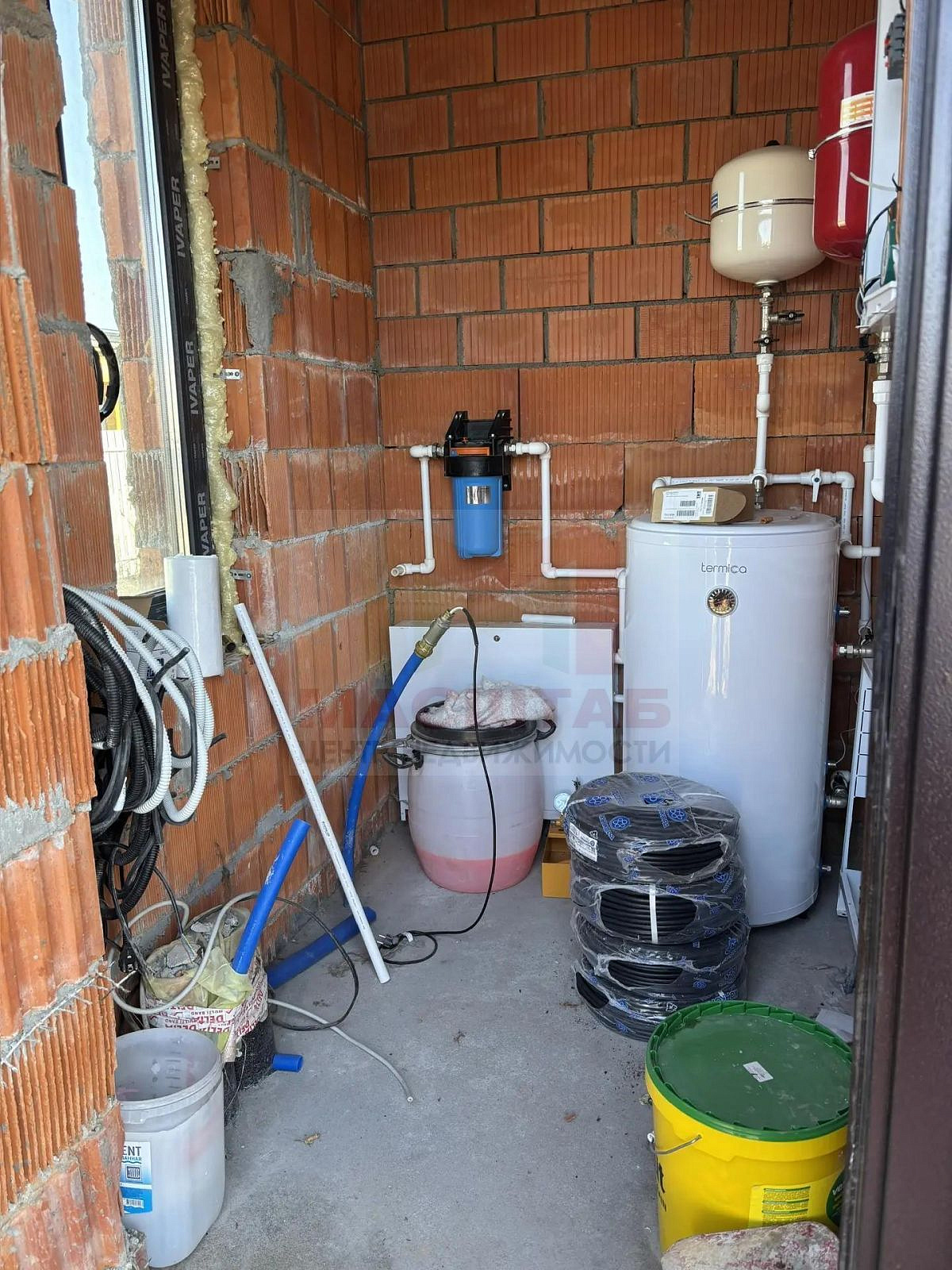 Дом из красного керамического блока, фундамент - плита. В доме собрана котельная (котельная с отдельным входом), разведена электрика, теплые полы, залита стяжка. Установлены септик и скважина, газ заведён на участок.