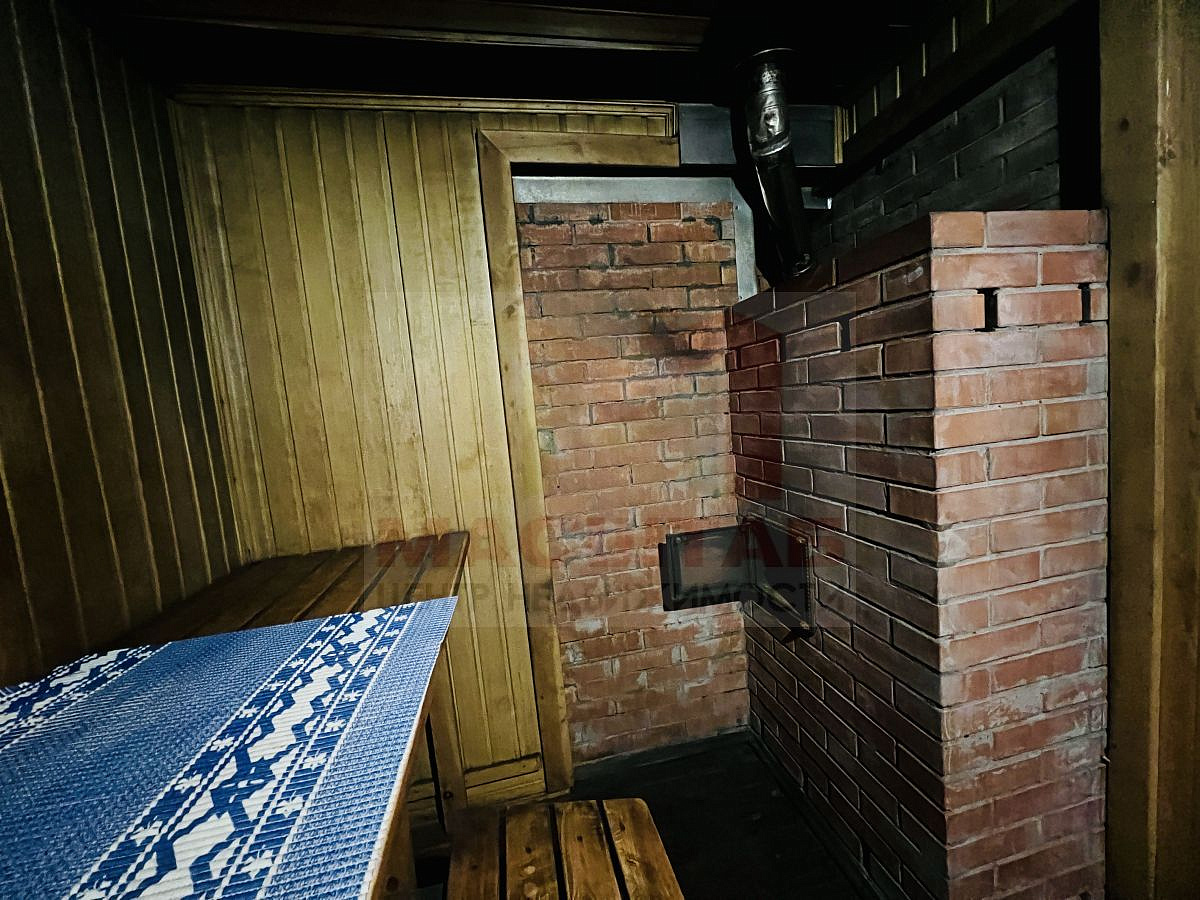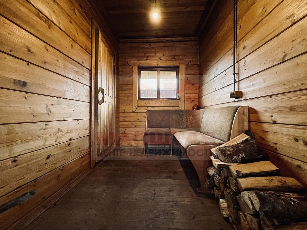 Дом возведен из клеенного бруса, имеет два этажа. На первом этаже располагается баня, второй этаж большая комната.